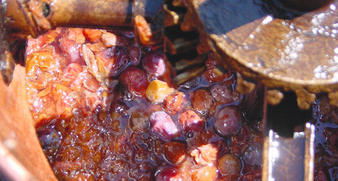 糖分を酵母が食べるわけですから、当然糖分が無くなるまで発酵を行えば辛口、糖分を残せば甘口となります。アルコール発酵が終わった液体から果皮や種子を取り除き、果汁だけにして濾過を行います。