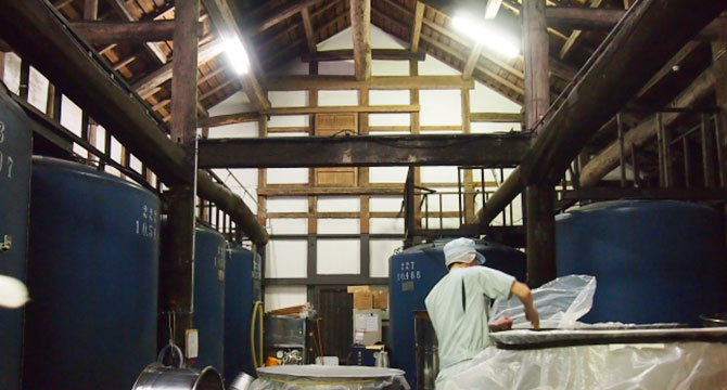 日本酒では、酒母と呼ばれる重要な材料が造られます。まず、専用のタンクに乳酸と麹を入れて、水麹というものを造ります。その後、この水麹に蒸米と酵母を投入すると、酵母が増殖していきます。