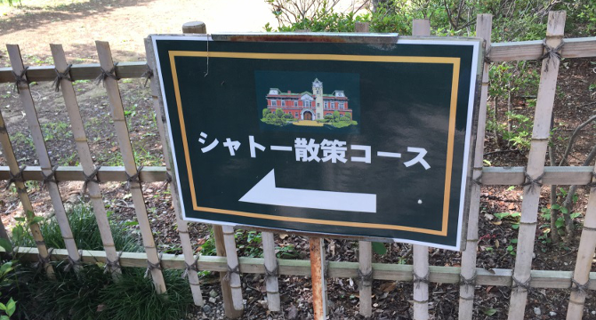 さてさて、レストラン キャノンの裏手を回り舗装された道を歩いていくと、シャトー散策コースの看板が見えました!