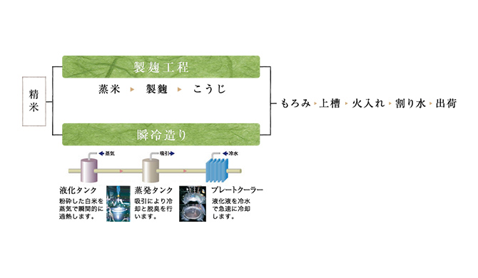「“瞬冷造り”とは、製造工程において連続して移動する原料に対し、瞬間的に熱を加えて液化し、急速に冷却する製法で、とどまる熱量が少なく原料に優しい当社独自の清酒製法です。